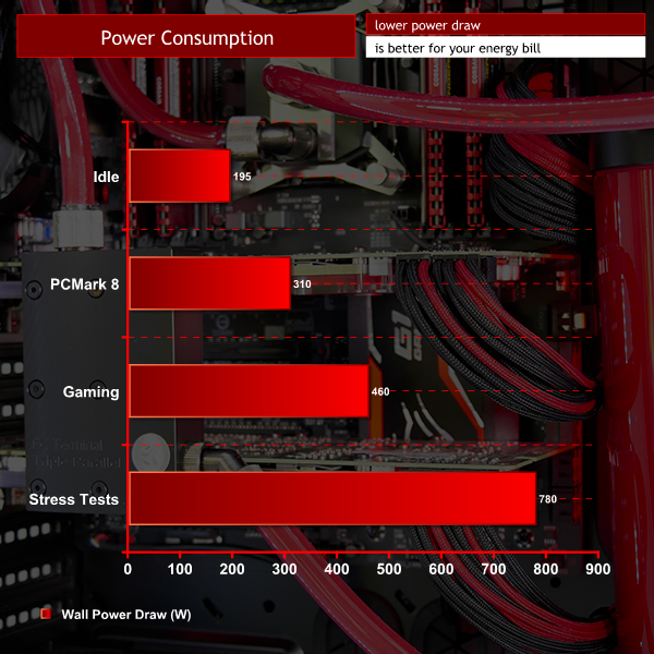 Power draw is interesting as DinoPC has selected an 850W Corsair PSU which appears at first glance to be a bit lightweight. After all, does 850W sound enough for a Core i7-5930K and dual GTX980 Ti graphics cards? When the system idles on the desktop it draws 195W at the wall socket, rising to 310W to run PCMark 8 and 460W for 3DMark or Thief.