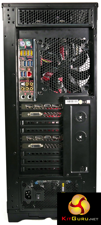 On the graphics side of things the stock figures for GTX 980 Ti 6GB cards are: Core 1000MHz, boost 1076MHz and memory 1753MHz (7012MHz). The two cards in this PC are overclocked to run at: Core 1220MHz, boost 1296MHz, memory 1928MHz (7712MHz).