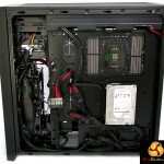 If you listen closely you can certainly hear the fans working however the low 960rpm speed that DinoPC dialled in with the Lamptron fan controller makes them effectively silent. It is hard to be sure whether the small amount of noise you can hear is the sound of the fan blades turning or the air moving through the system, however there are no annoyances such as a ticking pump.