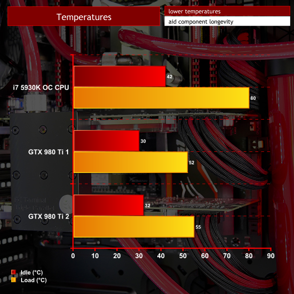 Under extreme load, using AIDA64, the CPU temp rises to 80 degrees while the GPUs run at 52 and 55 degrees. This synthetic workload stresses the hardware far more than a game or other real world software yet the cooling system sheds the heat without any trouble.