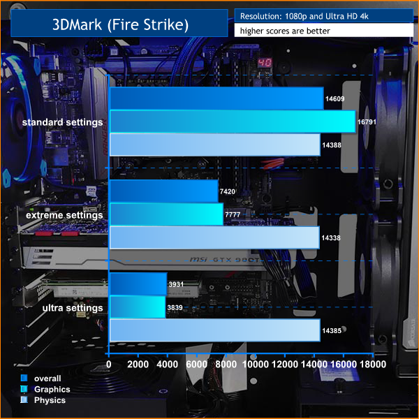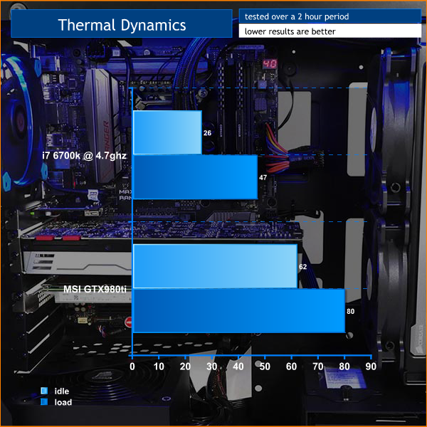 Gamers will concentrate on the guts of the system which consists of a Core i7-6700K that has been overclocked to 4.7GHz, along with a reference speed GTX 980Ti 6GB and super-fast 400GB Intel PCI Express SSD with NVMe.