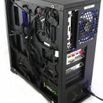 The Corsair H110i GT liquid cooler is mounted in the front of the case and, as mentioned, is cooled with two Riing fans. There is a third Riing fan at the rear and most of the light from these fans and the LED lighting kit is visible through the side panel with a small amount spilling at the front. The system looks really dramatic without also being annoying or distracting, and that is a neat trick to accomplish.