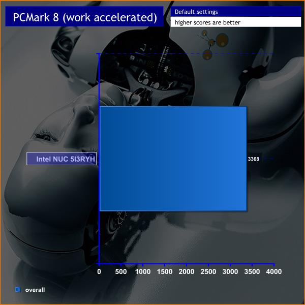 The performance of NUC5i3RYH is all about the Core i35010U. It delivers adequate performance but of course falls short of the ability to play serious games. Compared to the Core i5 it is slightly less responsive and on paper it is less impressive. While the extra 20 percent performance offered by Core i5 isn't strictly necessary, the extra zip and zing is very appealing, even though Intel charges a considerable amount of extra cash for the Turbo feature.