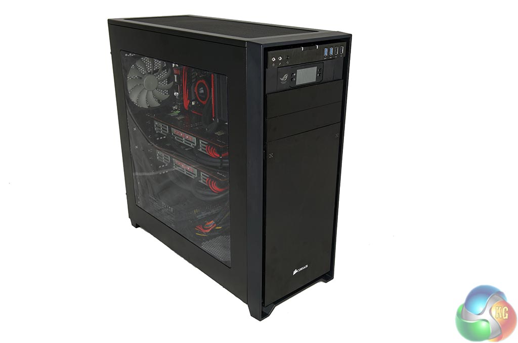 Along the top of the unit is the I/O panel featuring the power button, headphone and microphone ports, alongside 2x USB 3.0 and 2X USB 2.0 ports. Directly underneath is the Asus ROG OC Panel. There is no ‘Overclockers UK' branding on the front, just the Corsair logo along the bottom of the case.