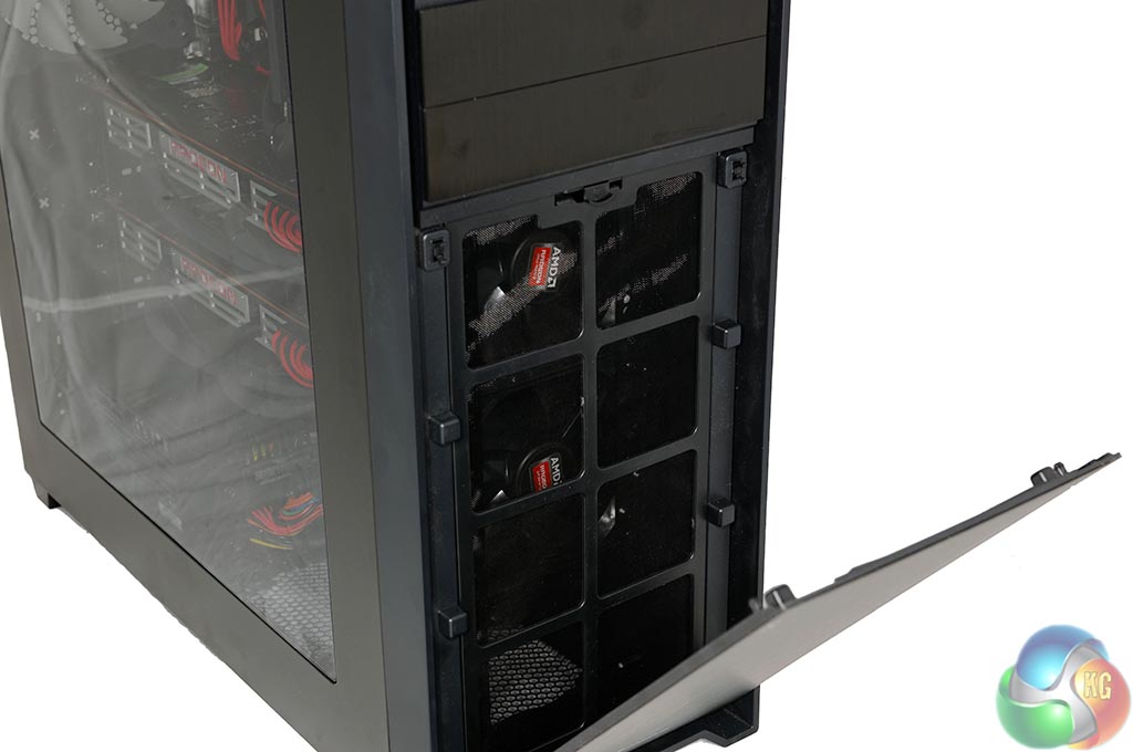 The Corsair Obsidian 750D ships with a removable dust filter so getting access to the two 120mm fans is easy enough. Handy if you want to clean them without removing the radiators.