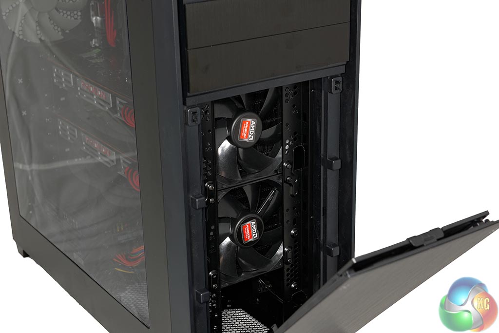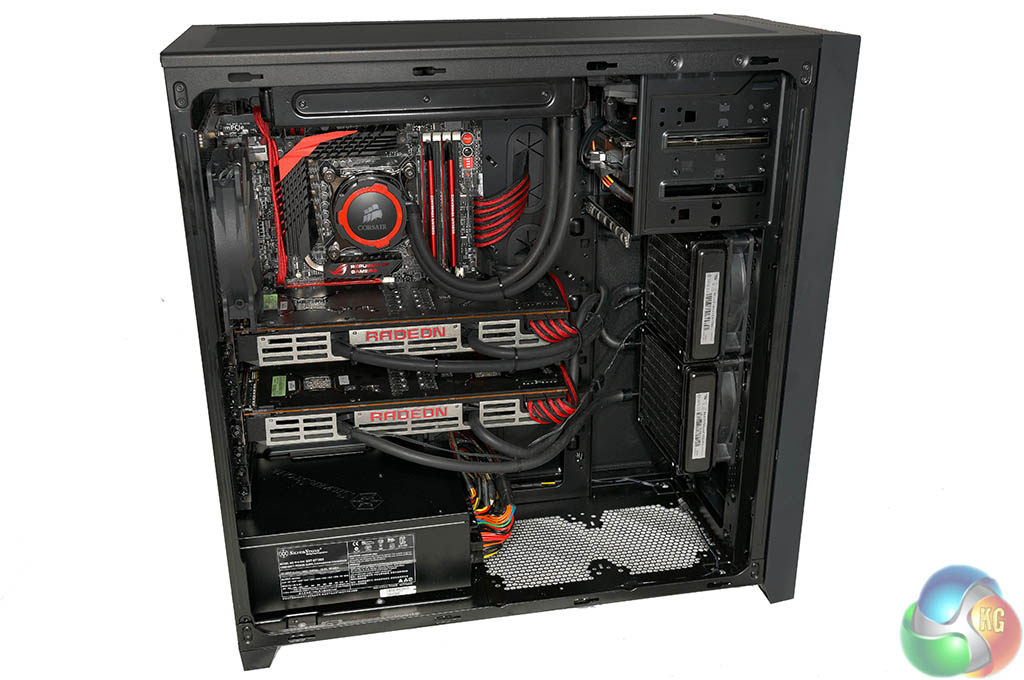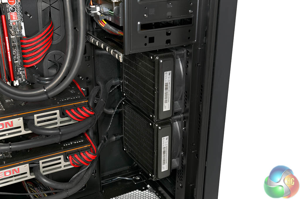 Each R9 295X2 is cooled by a 120mm radiator and we can see they are both fitted at the front of the chassis, with fans positioned to intake. It is worth pointing out that the liquid inside the R9 295X2 radiators will get warm under load, so the intake air won't be entirely cool by the time it leaves the radiator to hit the rest of the system components behind it. Not ideal – but as the 4770k is cooled by the Corsair H105, fitted to the top of the Obsidian 750D – OCUK were out of options.