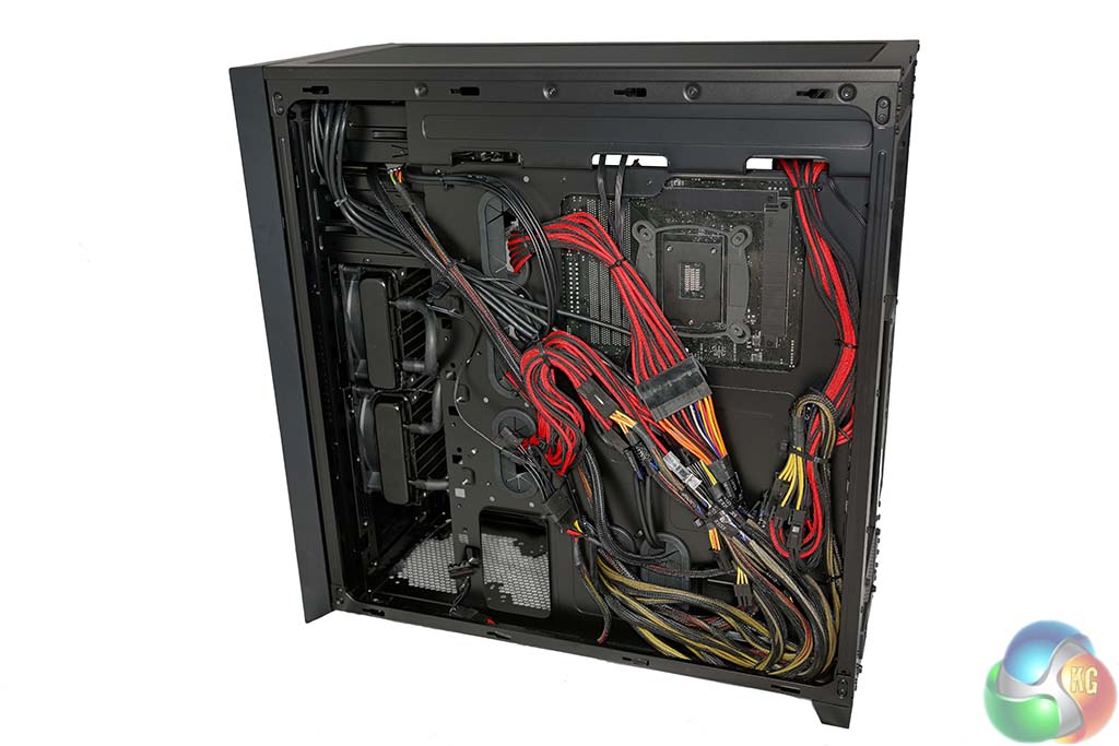 The other side of the chassis is home to many of the cables, shown above. OCUK are using black and red braided cabling so the ugly standard power supply cables can be hidden easily enough out of sight.
