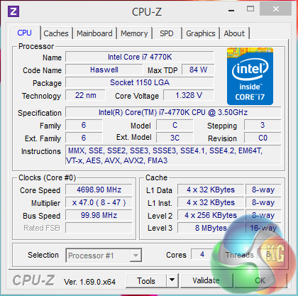 The system we reviewed today ships with a 4.7ghz clock speed, although due to the heat and variance when overclocking a Haswell processor, OCUK do mention ‘overclocked to at least 4.6GHz' on the “Infinity Vesuvius” system page. As a side note, KitGuru's three 4770k engineering samples are relatively poor overclockers, hitting between 4.5ghz and 4.6ghz – so we can understand why OCUK list this.
