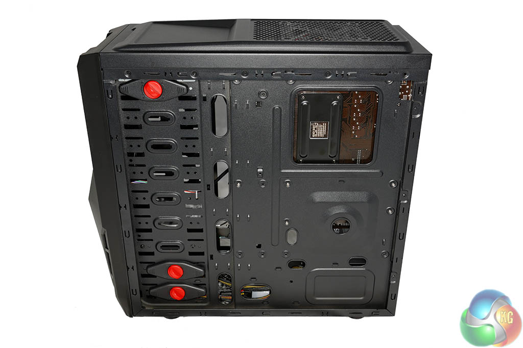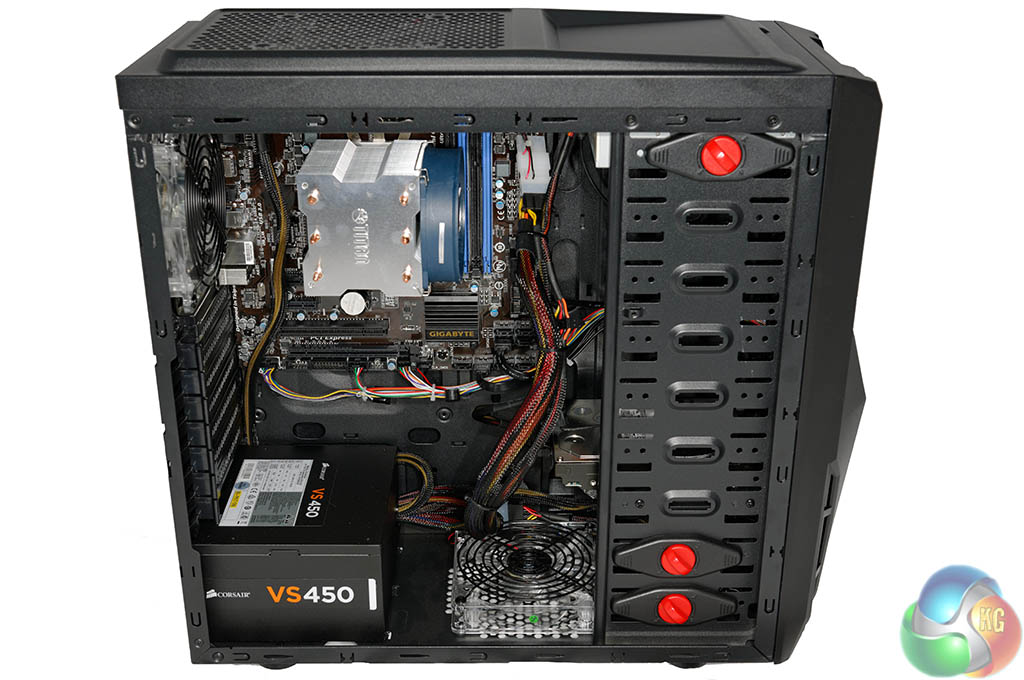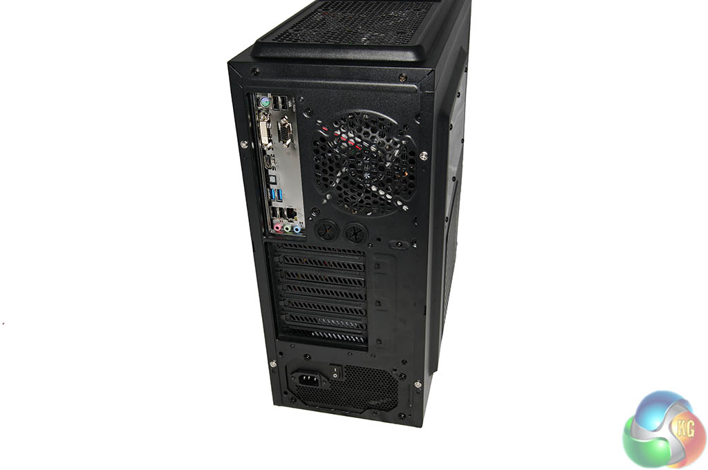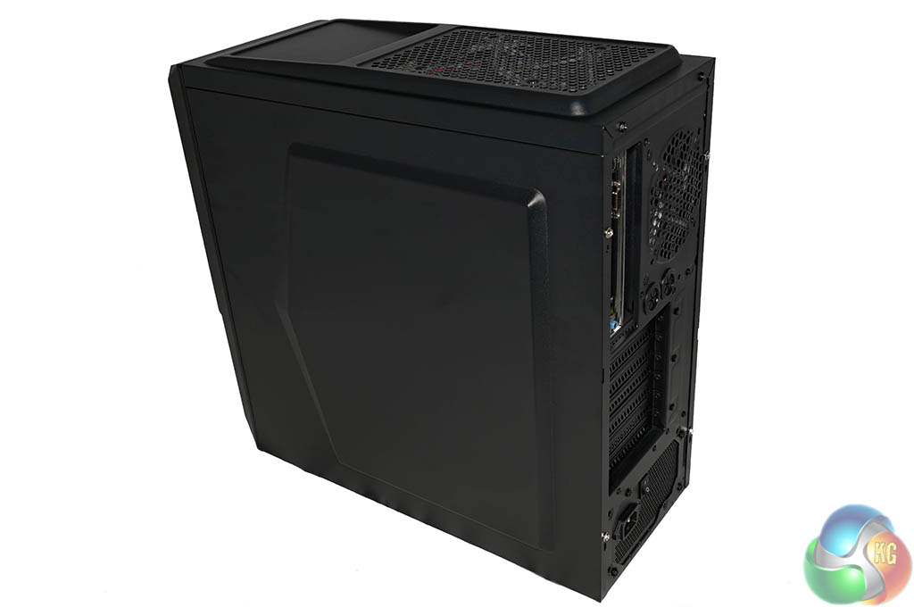 PC Specialist are using their custom ALPHA TRION 7622B case which is clearly designed to fit a specific budget price point. It is not the ugliest case we have seen, but it certainly won't be winning any beauty awards. The thin panels flex under pressure and are a little tricky to refit. Thumbscrews are not supplied, so a screwdriver is always needed to get inside the chassis. The screws don't lock in place – once a certain tension is met, they spin indefinitely. The insides are painted black however there is really no support for advanced cable routing.