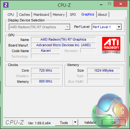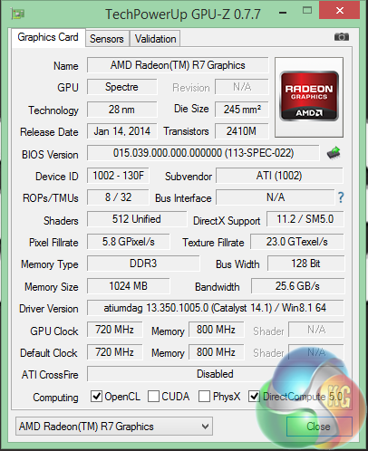 An overview of the system. The R7 graphics is clocked at 720mhz, with 8 ROPs, 32 TMU’s and 512 shaders. The 1GB of 800mhz GDDR3 memory is connected via a 128 bit interface. The 8GB of DDR3 system memory is clocked at 1,600mhz and runs at 9-9-9-27 timings.
