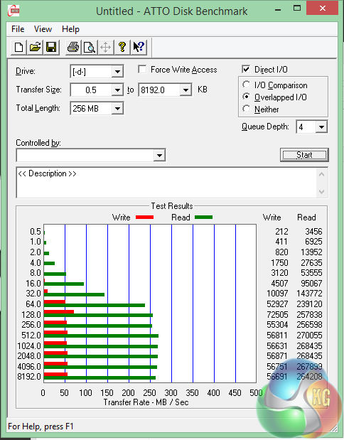 ATTO indicates maximum performance of 265MB/s read and around 60 MB/s write.