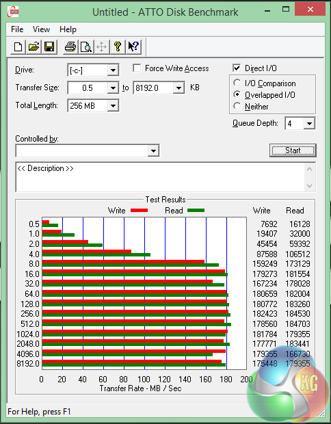 ATTO shows the same results as Crystaldiskmark, hitting around 180 MB/s.