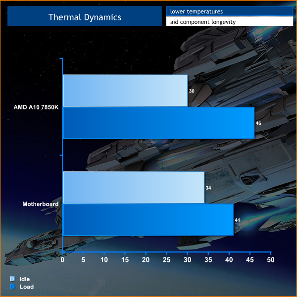 The system runs very cool under load. The low powered hardware doesn't get hot under load, and the large CPU cooler and decent chassis air flow help drive down the temperatures.