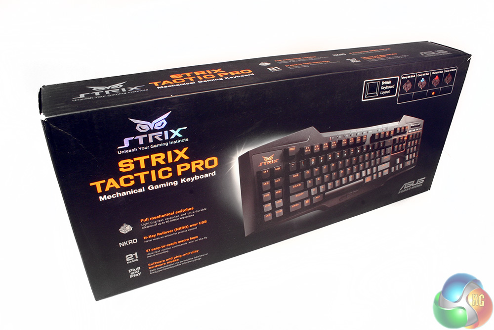 The ASUS STRIX Tactic Pro packaging is exceptionally good, as you would expect from ASUS. It breaks down some of the more important features of the board, as well as giving you a little sticker-ticked notice about which switches this specific version incorporates. The one I tested has Cherry MX red switches – but it is also available with black, blue and brown switch options.