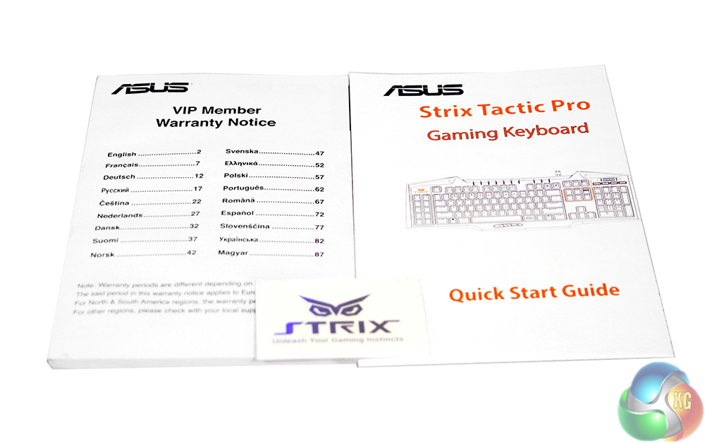 Along with the keyboard itself Asus supply four replacement orange key-caps, with a little key for removing them as needed and some documentation that covers warranty and the quick setup.