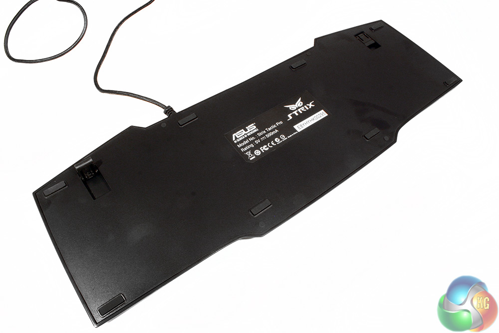 The underside of the STRIX Tactic Pro is pretty unremarkable, with the usual flip-up feet to angle it for those that prefer that set up. There are also small rubber feet located in specific places to make sure that the board does not slide around during use.