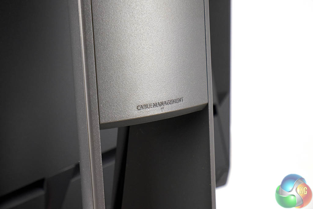 The arm of the stand has a built in cable management system. You feed in the cables from the bottom and up through the top – to keep them basically hidden from view when you look at the screen from the front.