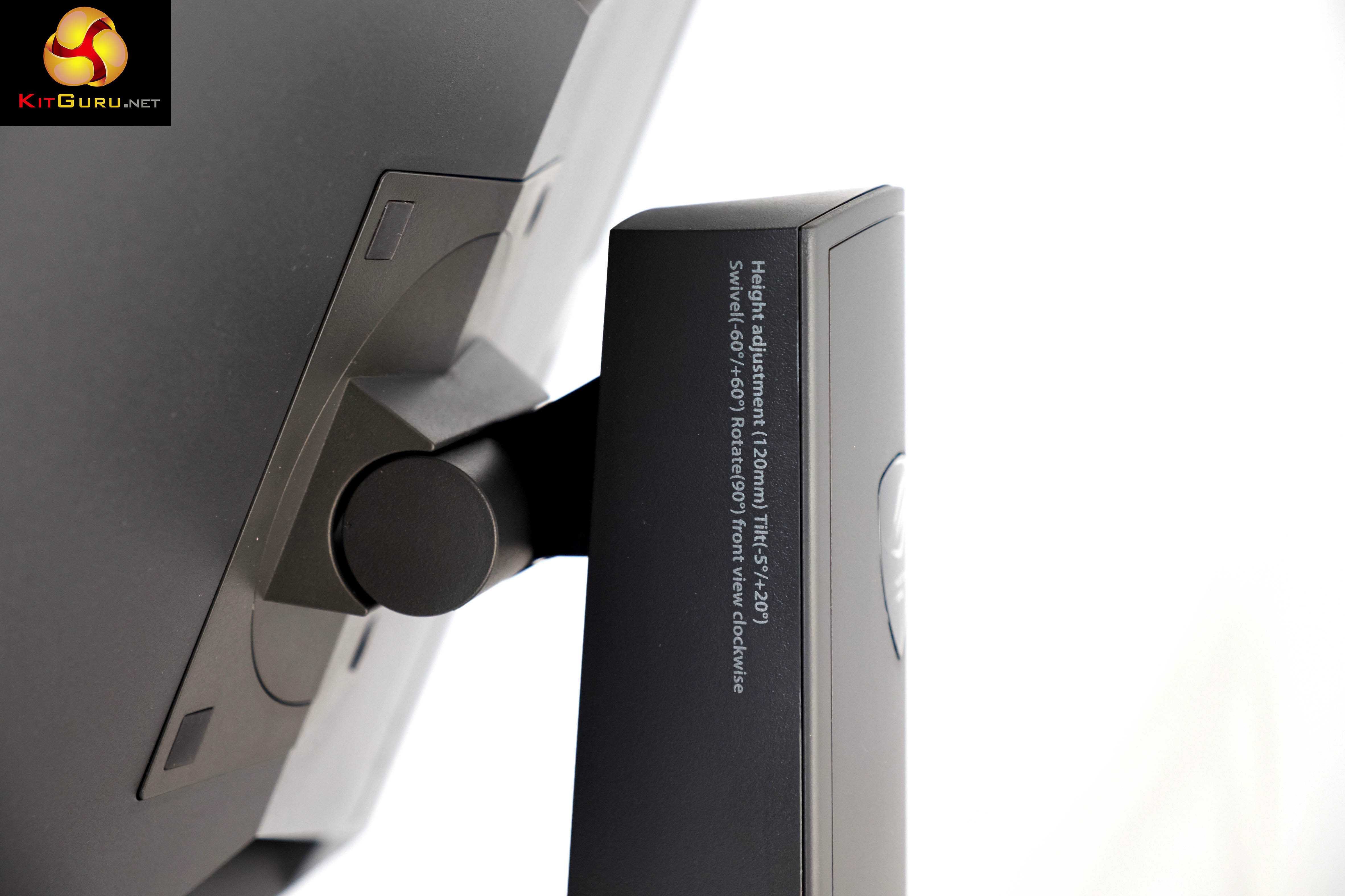 The sturdy stand deserves a little discussion. Height adjustment is possible – across a range of 120mm, by simply pulling or pushing up and down on the screen. It can be tilted (+20° ~ -5°), swiveled (+60° ~ -60°) and pivoted (90° clockwise).