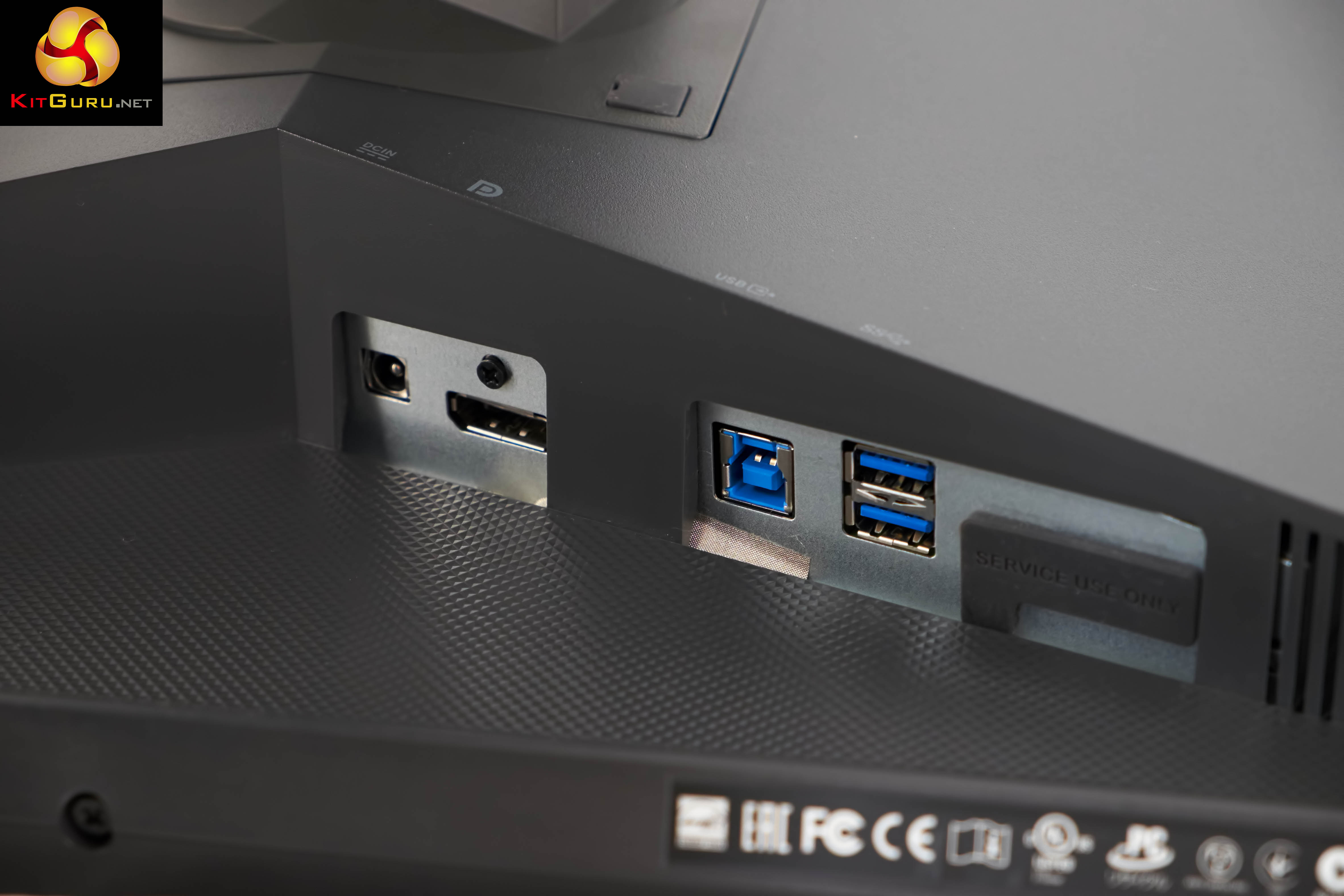 At the back of the screen is the connector panel. From left to right: power adapter connector, DisplayPort connector, USB 3.0 upstream port, dual USB 3.0 hubs.