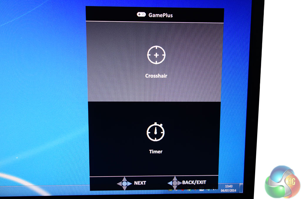 Underneath the nipple (erm, Joystick) … looking like they belong on the control panel of an alien space ship, are four angular buttons. The top button is for Exit, second button is for Gameplus, third button is the Turbo Key to switch between 60hz, 120hz and 144hz modes. The bottom button is for powering the screen on and off. The GamePlus feature offers four different overlaid crosshair targets to use during the game. The on screen timer can be positioned top, middle or bottom of the left hand edge of the screen. If we wanted to pick holes, we could say that ASUS could have placed the power button in a different position to avoid accidental activation. Thankfully, due to the large size, it is easy enough to avoid.
