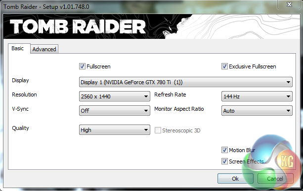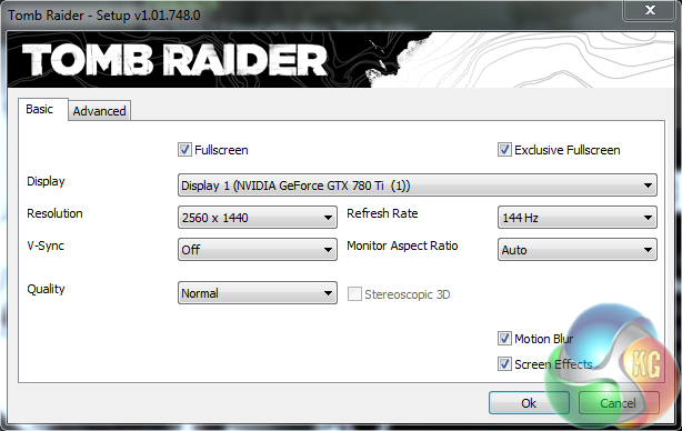 A double check of the Windows display options, highlighted that 144hertz was enabled by default. We only tested today at the 144hz setting in 2D. Our 3D Vision glasses stopped working just before we started to test the screen and we have been unable to get a replacement pair in time. The first game we decided to test with was the latest version of Tomb Raider – a great game both to play and look at. For the purposes of this specific article we used the built in game benchmark. Remember we want to try and get a constant frame rate of 144 fps to match the maximum 144hz of the screen. This is not going to be easy at 1440p., even with an overclocked GTX780Ti. An advantage to G-Sync is that obviously you still get smooth, tear-free gaming at any frame rate. It is worth pointing out that thanks to Nvidia G-SYNC – there is no stuttering evident when the frame rate drops. We did test with some games that fluctuated between 120 frames per second and 60 frames per second. There was no indication of visible and distracting ‘tearing'. Incidentally you can still use the Asus ROG Swift PG278Q with AMD video cards, but G-SYNC is not supported.