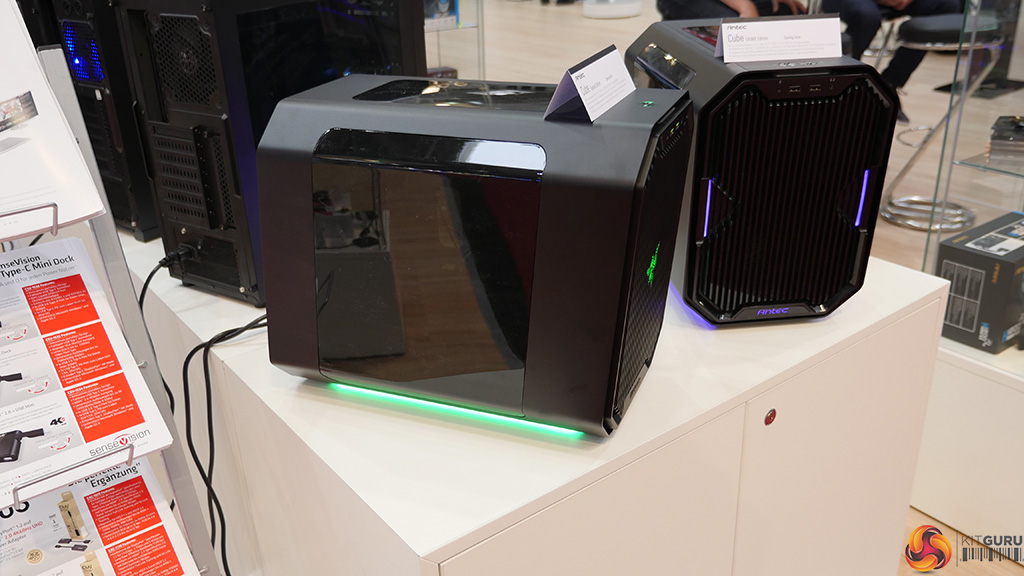 We got a look at two Antec cases at CeBIT. The first is the Cube Mini-ITX chassis, which is available in an EKWB version for liquid cooling enthusiasts. There is also a Special Edition Razer version of this case which you can already order from Overclockers UK.