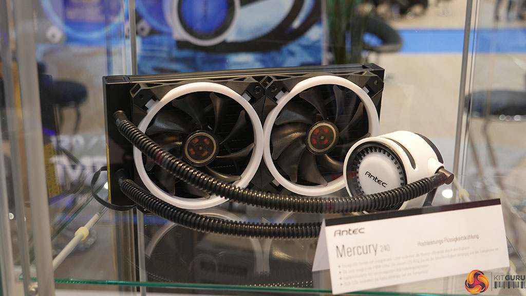 Let's start off with the liquid coolers. Antec has ‘pimped the pump' on its Mercury liquid cooler, this is the third version of this particular AIO and it seems that Antec has nailed the design down this time. The pump itself has RGB lights that respond to CPU temperature.