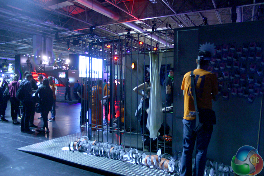 Introversion had several cells set up for people to try out its management sim, Prison Architect. It was also handing out cardboard headpieces for people to wear showing various states within the game, and there was a wall of ‘mugshots' of people who enjoyed it.