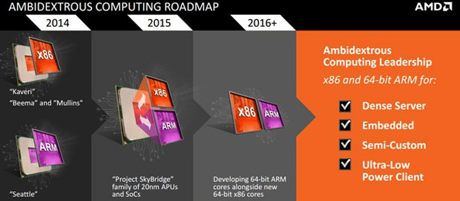 “Before today, AMD was the only company in the world to deliver high performance and low-power x86 with leadership graphics. AMD now takes a bold step forward and has become the only company that can provide high-performance 64-bit ARM and x86 CPU cores paired with world-class graphics. Our innovative ambidextrous design capability, combined with our portfolio of IP and expertise with high-performance SoCs, means that AMD is set to deliver ambidextrous solutions that enable our customers to change the world in more efficient and powerful ways”.