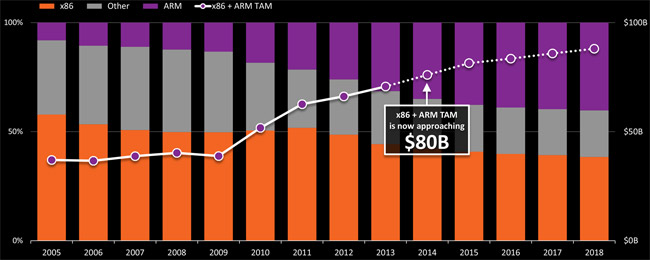 - In stark contrast, some experts are predicting that the TAM for ARM could be bigger than x86 by 2018
