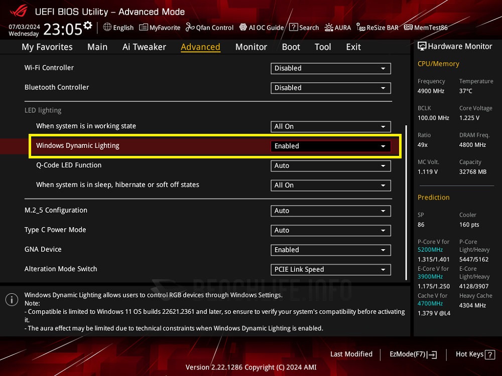 Asus has already enabled this feature for headphones and laptops, but it seems it has already started to extend support to include motherboards. A recent Benchlife report (via VideoCardz) revealed that Asus motherboards equipped with AMD 600 and Intel 700 chipsets (picture is of a ROG Strix Z790-E Gaming WIFI) now support Windows Dynamic Lighting. This functionality can be activated or disabled via the BIOS under the LED Lighting tab.