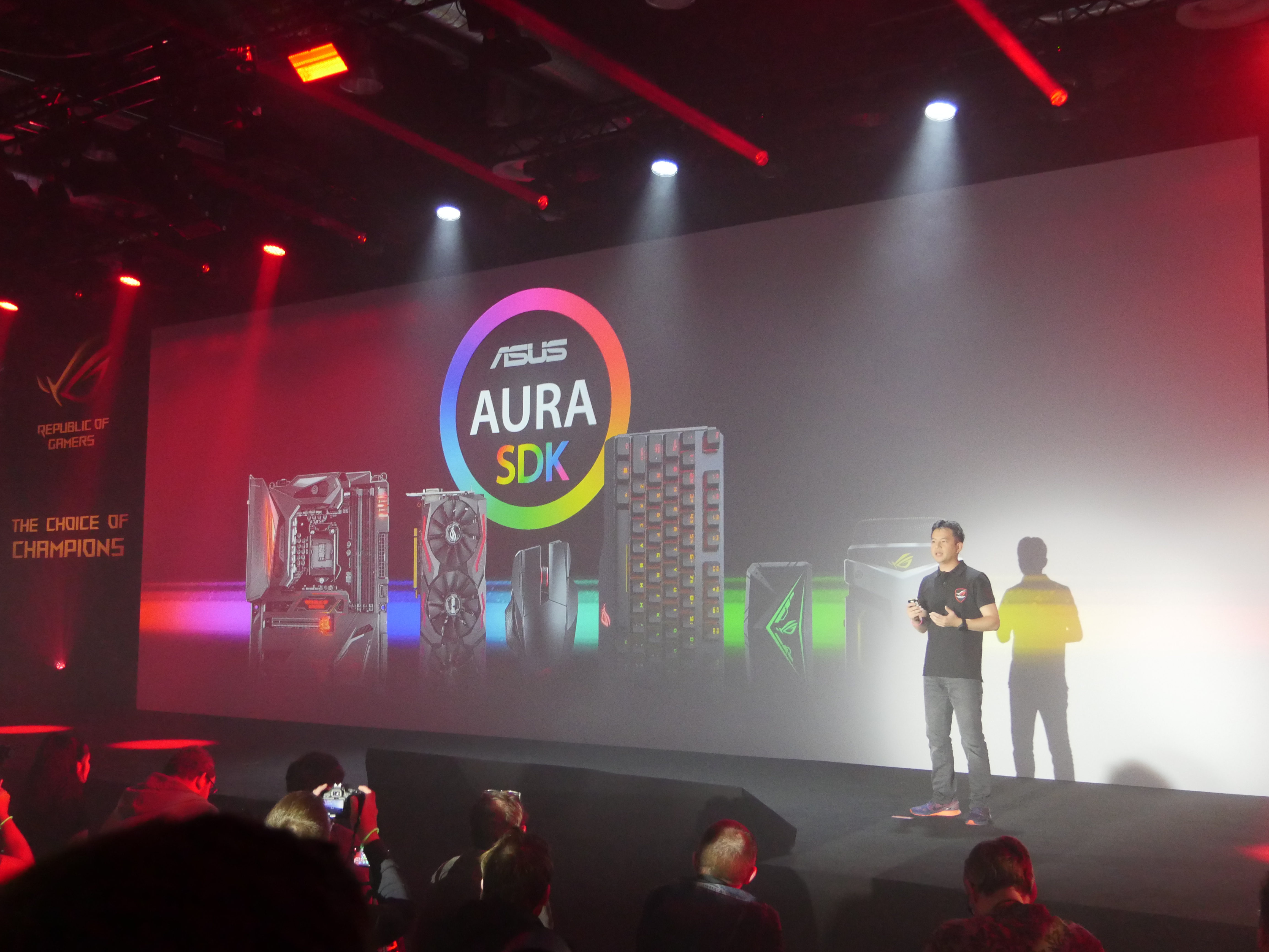 ASUS also announced the AURA SDK which will allow app developers to better program their software with AURA compatibility in mind. A demo was shown to be switching the system lighting colour based on the chosen class shown in a game and when taking damage from enemy fire.