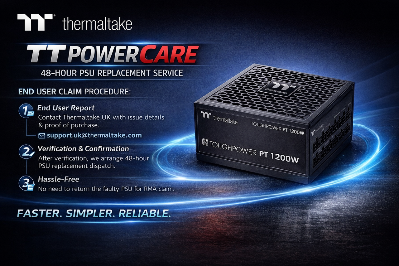 Starting from the 1st of March 2026, TT PowerCare will be introduced across Thermaltake’s PSU range, on top of the existing extended warranty. Under this new service, if a power supply unit is verified as faulty, Thermaltake UK will arrange a replacement within 48 working hours. On top of that, end users will no longer be required to return the faulty PSU, eliminating unnecessary downtime and logistical delays.