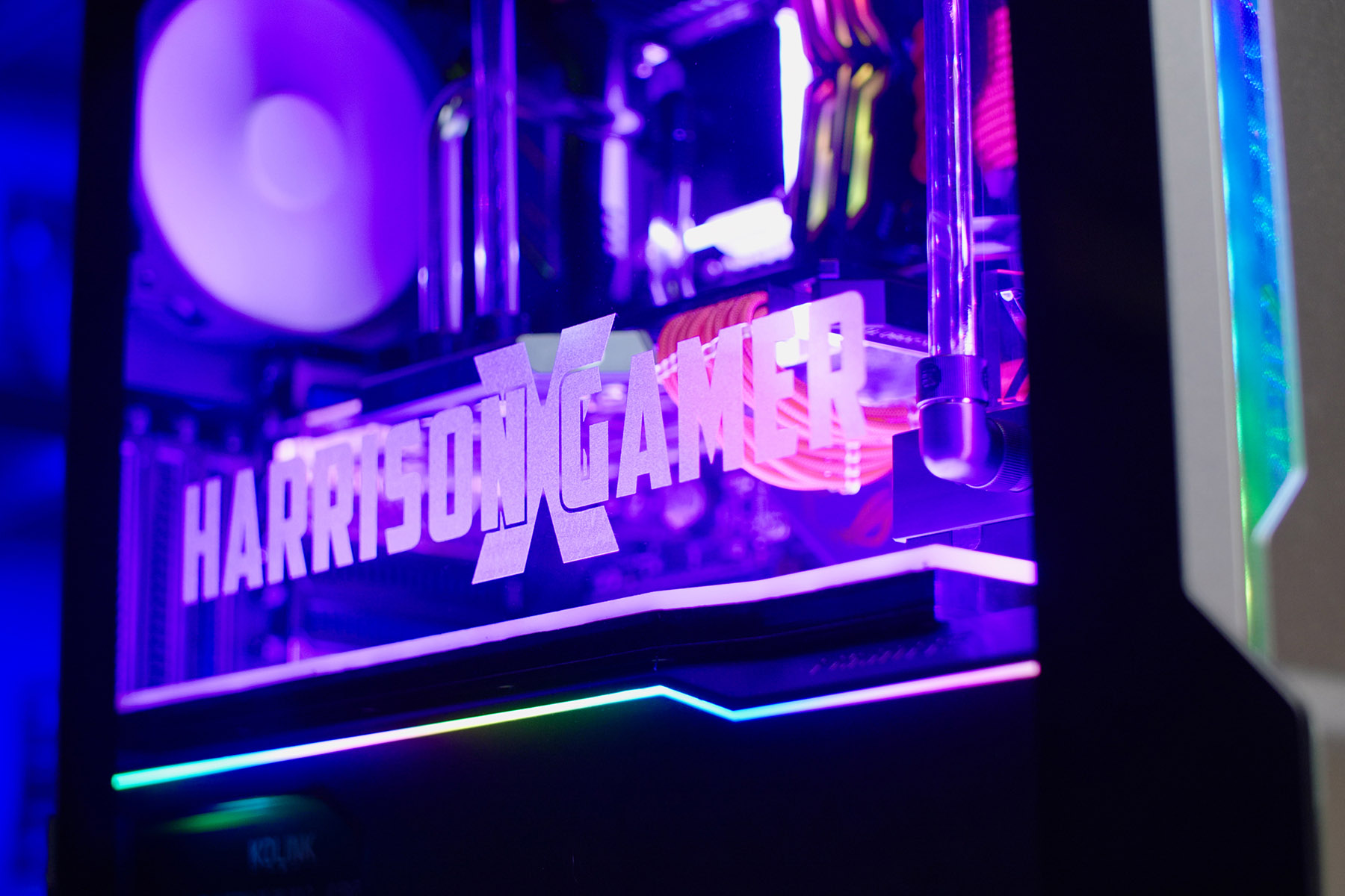 The gaming PC is based on the OCUK Infin8 Nebula system, with some extra customisation to fir with Harrison's chosen colour scheme. The in-house experts at Overclockers UK created the braided cables, put together the RGB lighting and created the lightbox at the bottom of the case. The OCUK team also etched the HarrisonXGamer logo onto the tempered glass window of the case, and wired the PC up to be switched on or off with a remote control for greater accessibility.