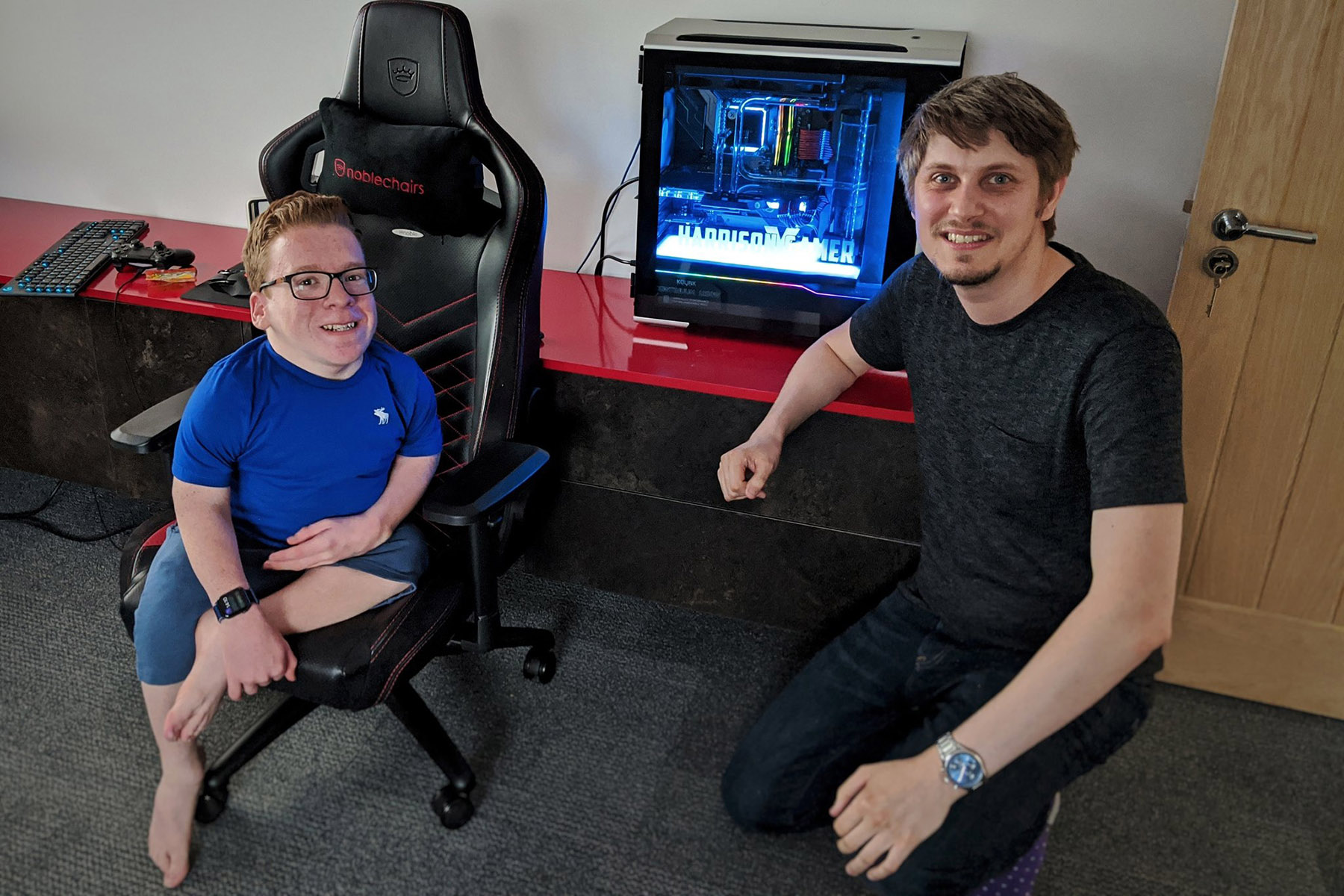 To go with this system, Overclockers UK worked with noblechairs to create a custom chair to better suit Harrison's needs. Both Harrison and Warwick have a rare form of dwarfism, so the metal frame under the seat was reduced in height, swivel functionality was removed and custom logos were printed onto the back of each chair.