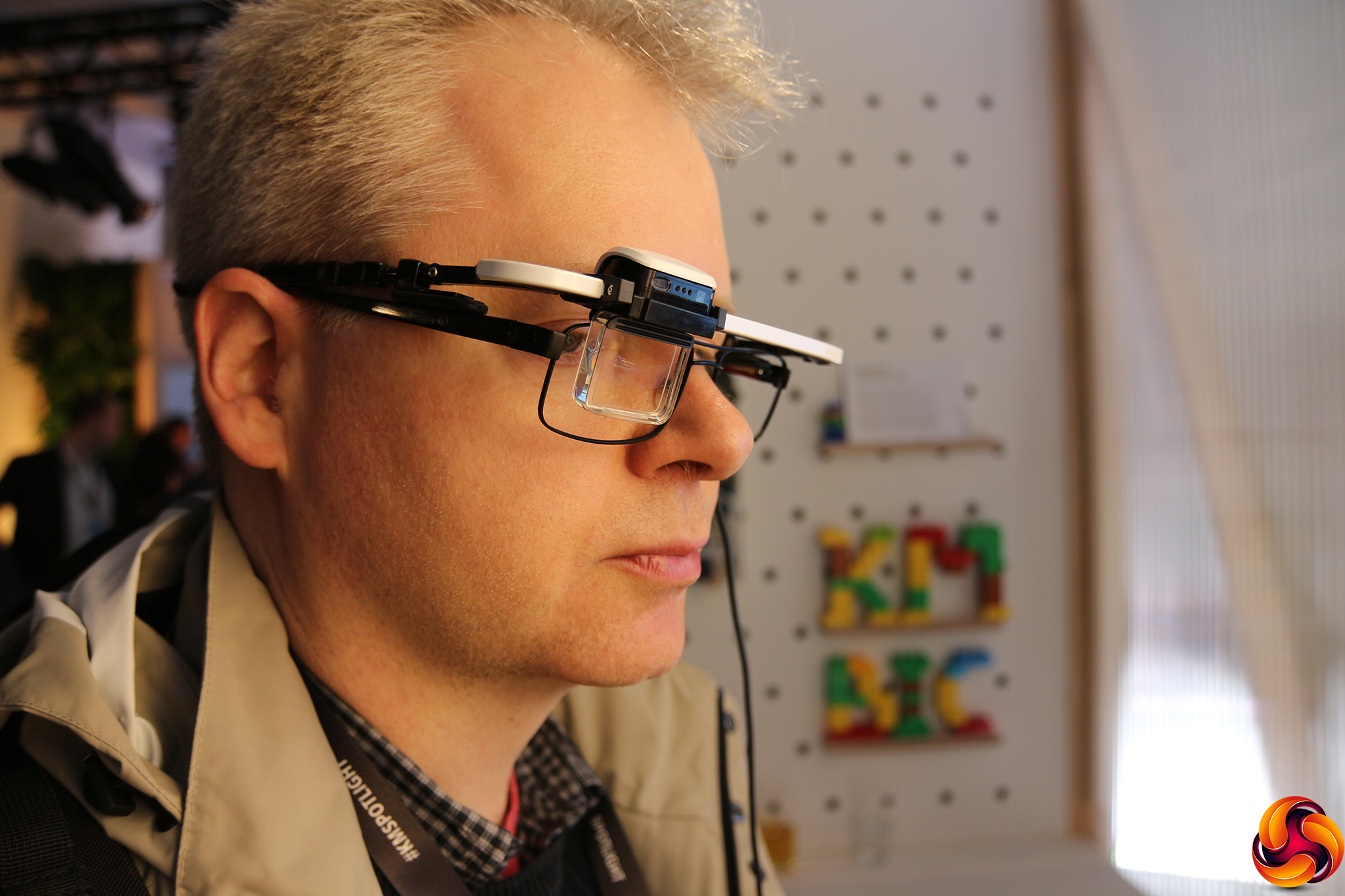 As part of its reinvention, Konica Minolta has set up a European Labs network to experiment with new concepts in workplace practice, and examples of the Labs' experimentation were also on show at Spotlight Live. One of the things they have been developing was the Google Glass-like Augmented Reality heads-up display system shown below.