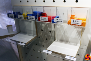 Instructions are fed in through the display, telling you to pick up various components, and how many. You scan the barcodes beneath each bin to show you have followed the instructions and are ready to move onto the next instruction.