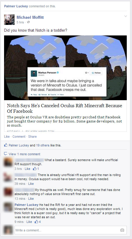 “[Notch] had the Rift for a year and had not even tried the Minecraft mod (which is really good), much less done any exploration work,” said Luckey in response to a Facebook post on Persson's comments. “I think Notch is a super cool guy, but it is really easy to “cancel” a project that was never started as an out.”