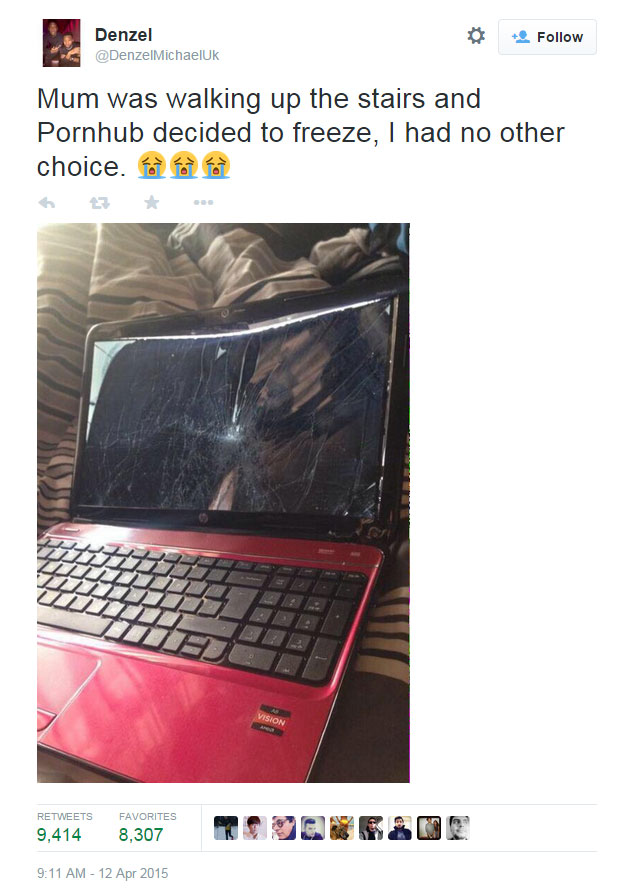 It sounds like the script for one of the Pornhub's many thousands of videos. One dedicated fan of the adult video site recently posted a picture of his broken laptop, after he allegedly punched the screen when it froze just as his mother was coming up the stairs. Apparently having no laptop is better than getting caught jerking it, but never fear, Pornhub has now announced it's giving the mega-fan a free PC to say thanks for the support.