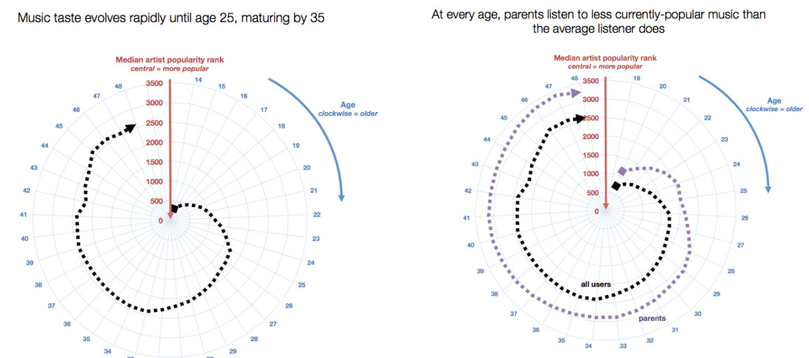 For example, young teens are most interested in popular music, which by its nature tends to be the music put in-front of them most often. However, as their age increases through their late teens and into their early 20s, people tend to diverge from the mainstream and discover music that appeals to them more uniquely.
