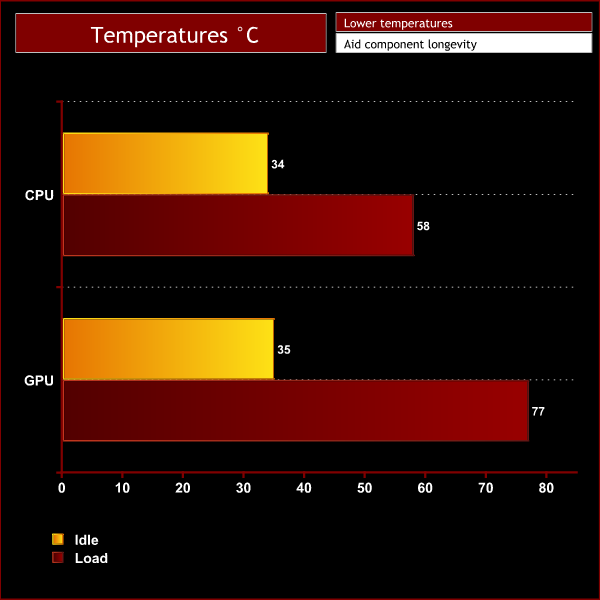 Idle temperatures are just what we expect with the fans running quietly and everything staying very cool. Under maximum load after running AIDA 64 for 10 minutes we saw the CPU reach a high of 58C and the GPU reached a high of 77C.