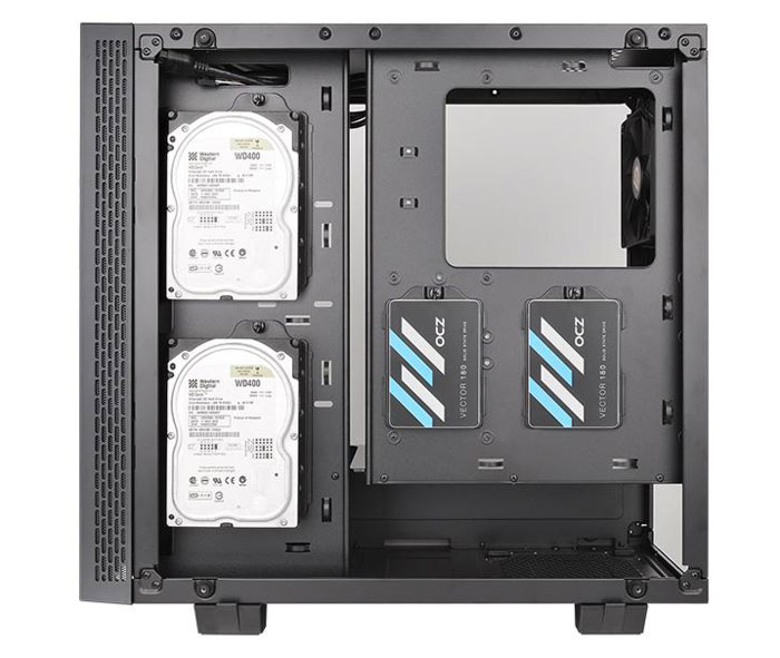 The View 21 natively houses up to 6 storage devices with two 2.5-inch and two 3.5-inch mounts, which can be install up to two on the front and four on its right side. Liquid cooling is supported with room for up to a 360mm radiator in the front of the case and a 120mm radiator in the rear. As for air cooling, one 120mm fan is pre-installed in the back with room for five more 120mm fans around the chassis.