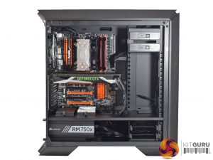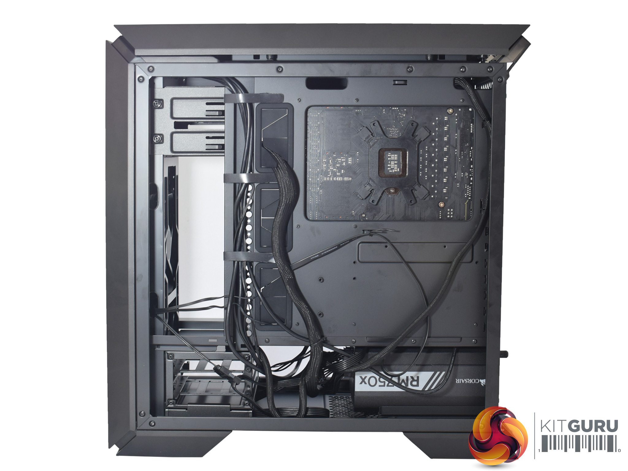 Round the back, I was not overly happy with how things turned out in the end, thought it is far from terrible. I found I was not able to route all my cables as tidily as I would have like due to a lack of cable tie-down points – there are about 5 or 6 at the back but they are spread out quite a bit which makes things difficult. In particular, the bottom edge of the motherboard tray has just a single tie-down point, and this is the place where I think there should be the most tie-down points.