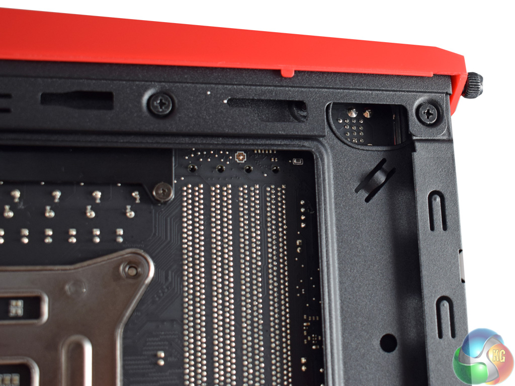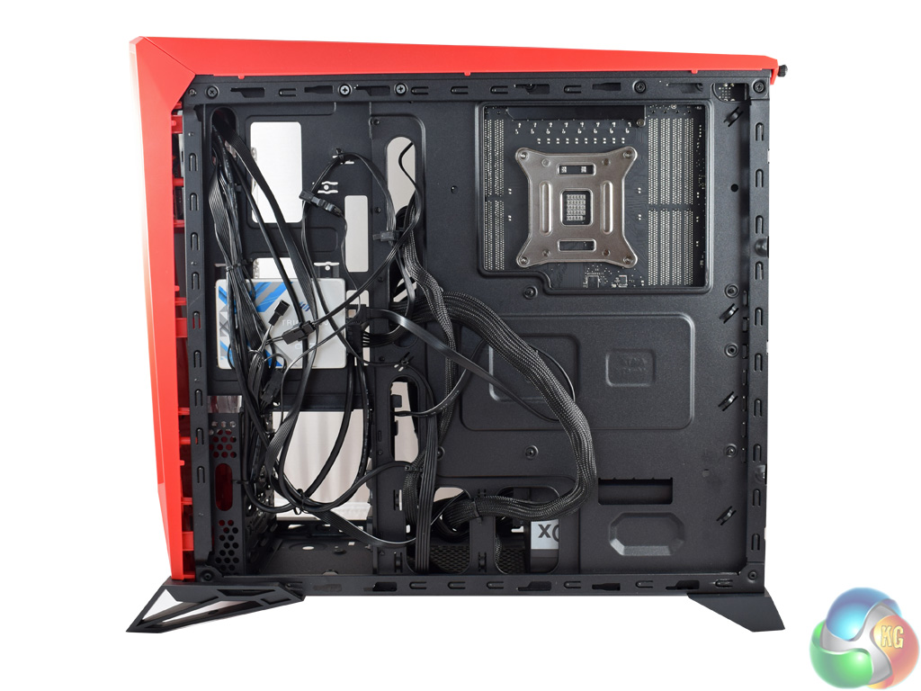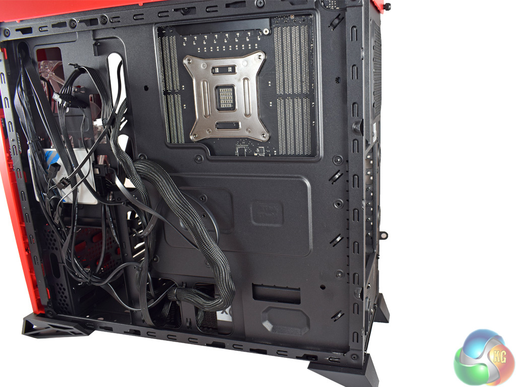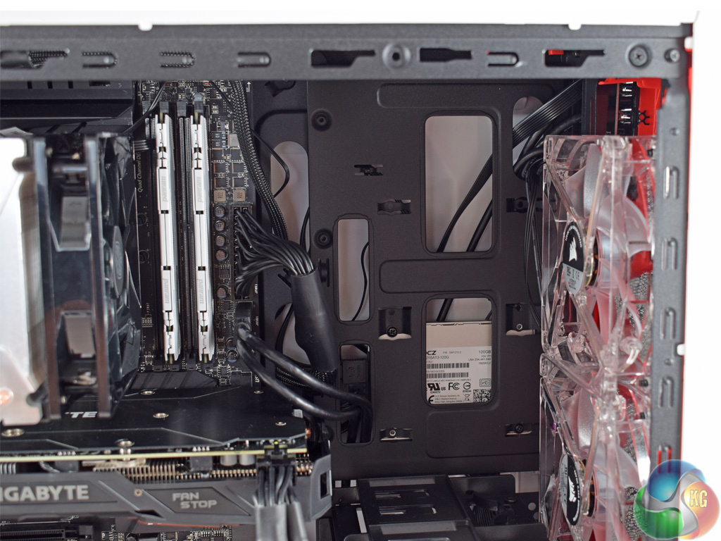 That being said, one of the case's problems elsewhere is actually too many cut-outs. As you can see above, the section of the case next to the front fans sports a number of cut-outs. However, this means you get a direct view of the backside of any 2.5in drive you choose to install there, as well as any cabling routed behind the motherboard.