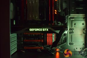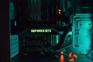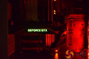 Above we get a look at the system powered-on. The different colours you can see come solely from the two RGB fans at the front of the case – they are nice and bright, with good coverage across the case. That being said, if you have a compatible RGB strip, you can actually connect this to the small RGB controller to extend the lighting further.