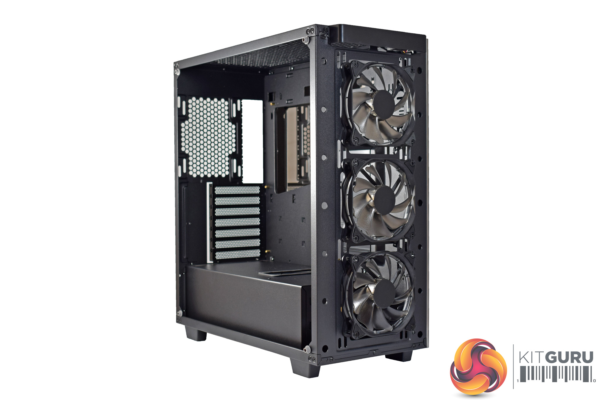 At the front of case, we find 3x120mm fans, pre-installed. These are RGB fans and actually arrived already hooked up to the front-panel fan controller.