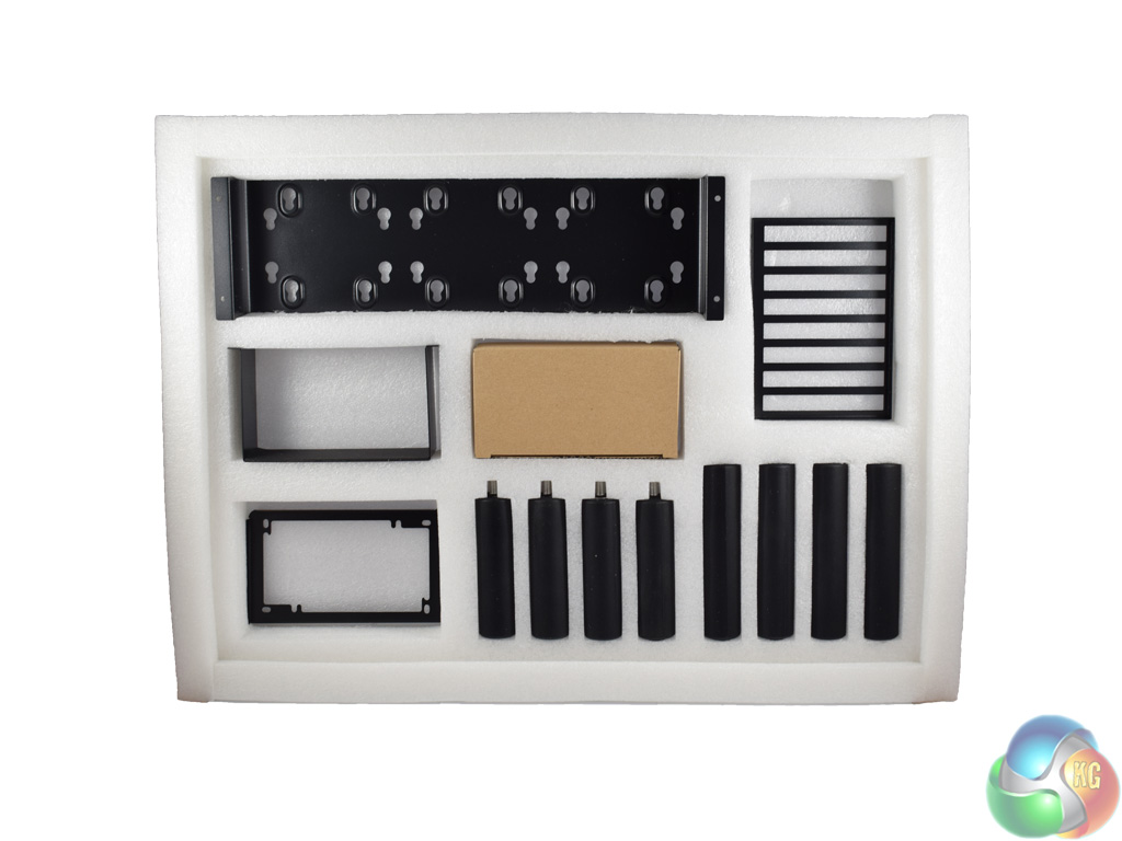 At the bottom of the box, all the additional pieces of hardware that we need are packed in foam padding. Here we find a HDD/SSD rack, the expansion slot bracket, a PSU mounting bracket, a PSU support bracket, and 8 chassis supports.