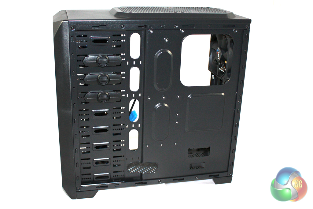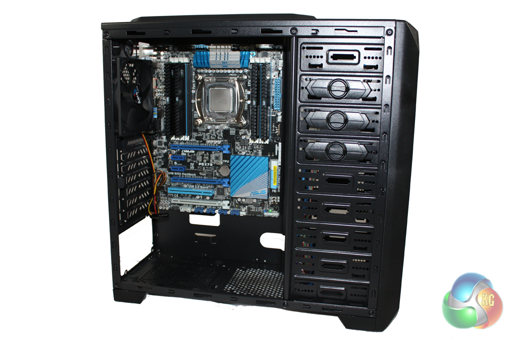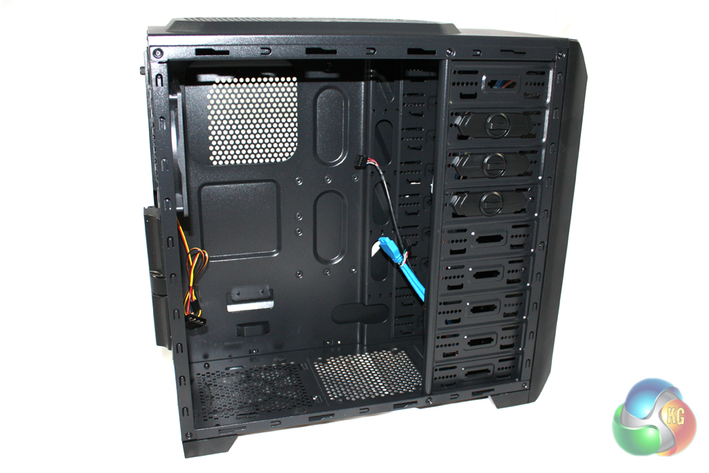 The drive bays are located on the right hand side of the interior, and provide very flexible configuration options. There are five hard drive trays included which will let you install both 2.5″ and 3.5″ units. All eight of the bays can also support 5.25″ drive bays. The main drawback of this configuration lies with the orientation of the drive bays. As they point towards the front of the case, it can be very difficult to change drives over once you have installed all of the other components into the system.