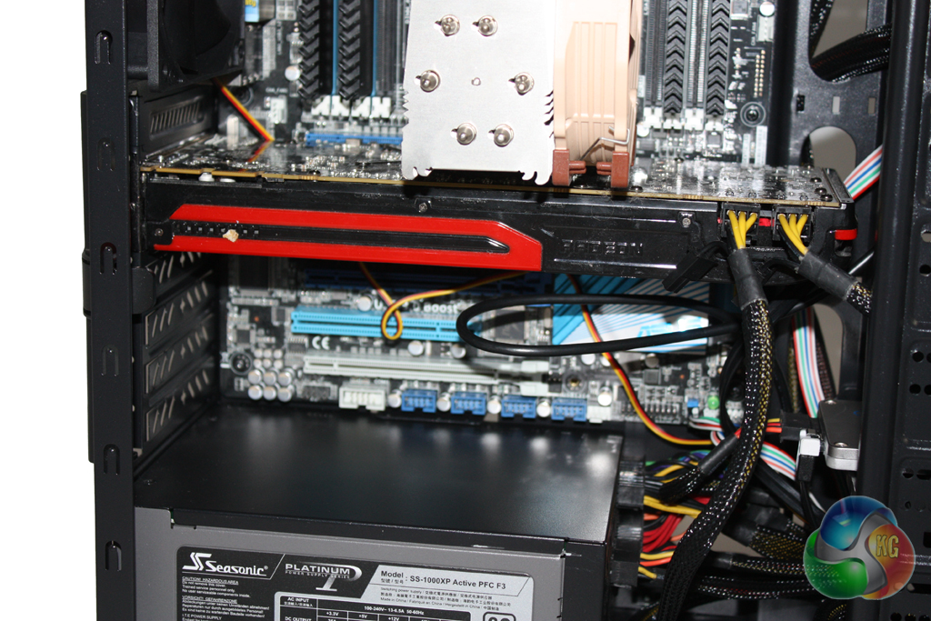 Aerocool have chosen not to use thumbscrews to secure expansion devices in place, opting for standard screws instead. This isn't a big issue, as we would usually recommend tightening thumbscrews with a screwdriver anyway. It does make graphics card installation a little more complicated, though. We also found it a little more challenging than usual to put our AMD Radeon HD 7950 graphics card into place as the drive bays get in the way.