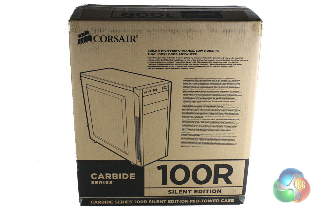 The Corsair Carbide 100R is supplied in a sizable brown cardboard box which reflects the size of the case within. It is decorated in a black livery which features a large image of the case on the front.